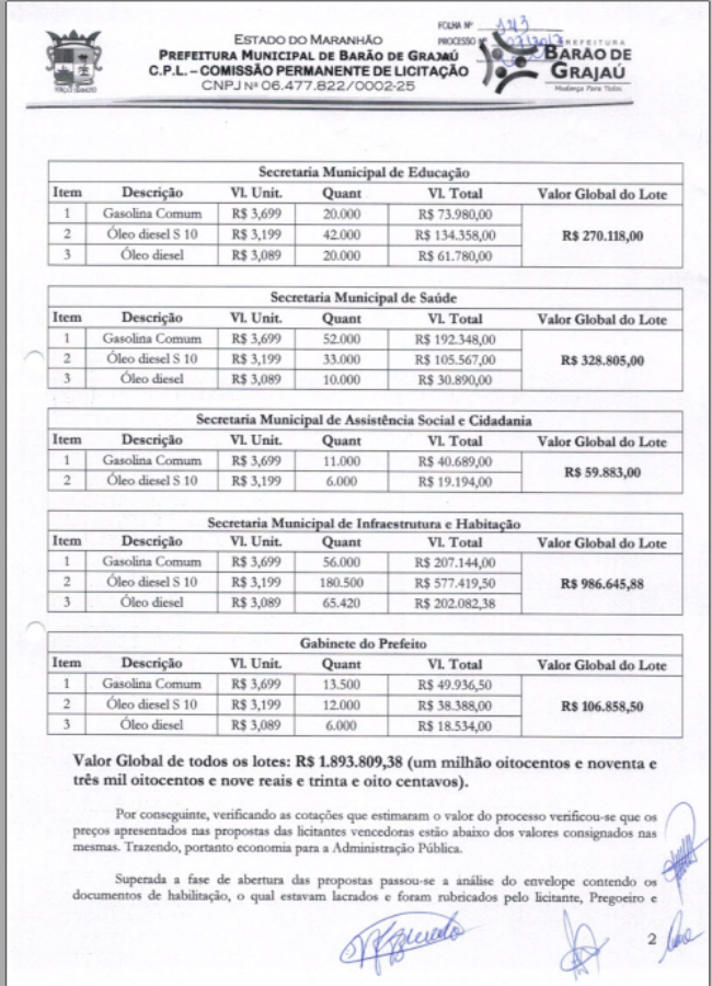 Segundo os Documentos obtidos pelo blog o prefeito Cleydson Resende, a firmou um acordo com a empresa no valor de R$ 1.893.809,38 milhões para fornecer combustíveis (gasolina comum e diesel s10 e lubrificantes), destinados ao atendimento das necessidades das Secretarias do município.