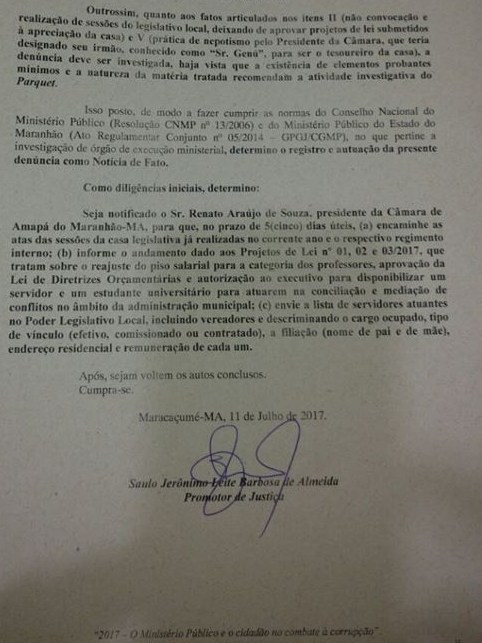 O Ministério Público notificou o Presidente da Câmara de Vereadores de Amapá do Maranhão ” Renato Araujo de Sousa “, solicitando informações no prazo de 05 dias úteis sobre: