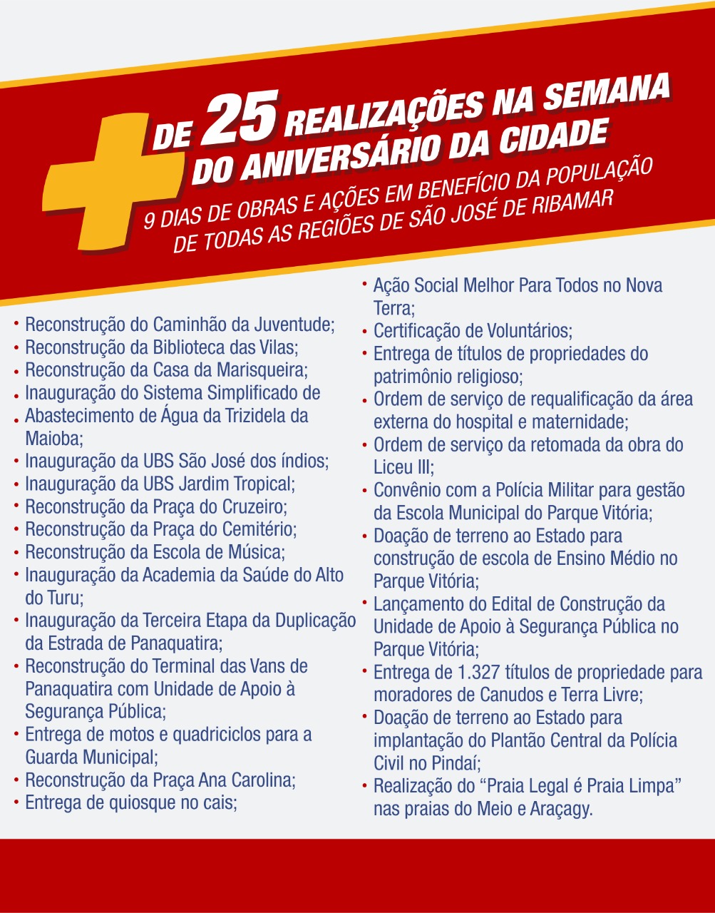 A programação, que teve início no último dia 16 com uma grande ação social no bairro Nova Terra, fechou com a entrega de pelo menos 15 obras, incluindo a reconstrução de praças, UBS’s, duplicação de avenida, entre outras, além de 11 ações de grande impacto social e econômico, a exemplo da entrega de 1.327 títulos de propriedade beneficiando moradores dos bairros Canudos e Terra Livre, na região do Parque Vitória.