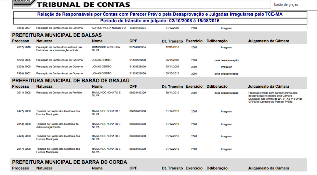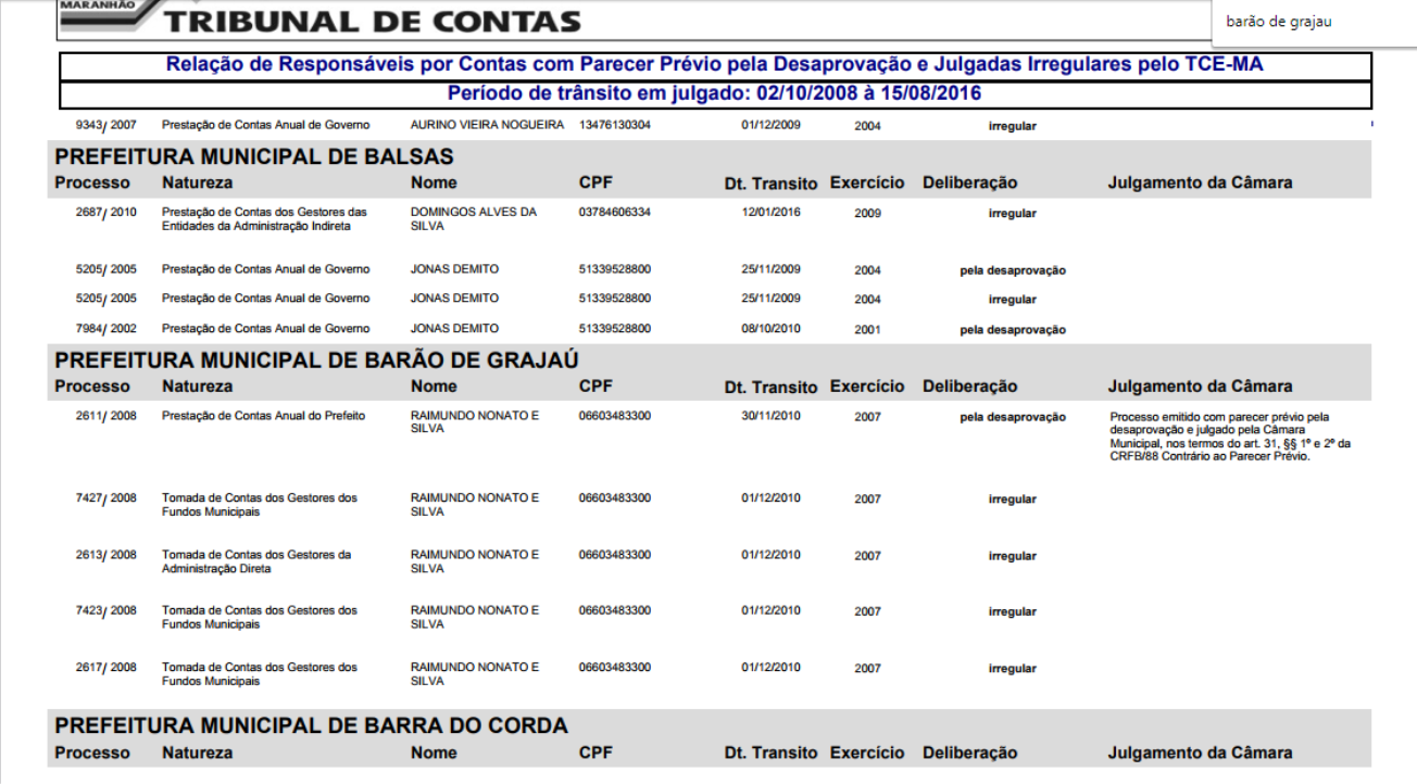 Além do Ex-prefeito Raimundo Nonato e Silva de Barão de Grajaú, estão na relação constam os nomes de presidentes e ex-presidentes de câmaras municipais e de gestores de órgãos da administração direta e indireta do Estado e dos municípios do Maranhão, além de contas de convênios estaduais e federais geridos pelos chefes dos Executivos municipais.