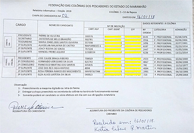 A segunda Chapa apresentou todos os documentos necessários para homologação da eleição, para presidente da colônia de pescadores z53 de Raposa, tendo como candidato a presidente o senhor Pierre Oliveira que já foi presidente da colônia de pescadores.