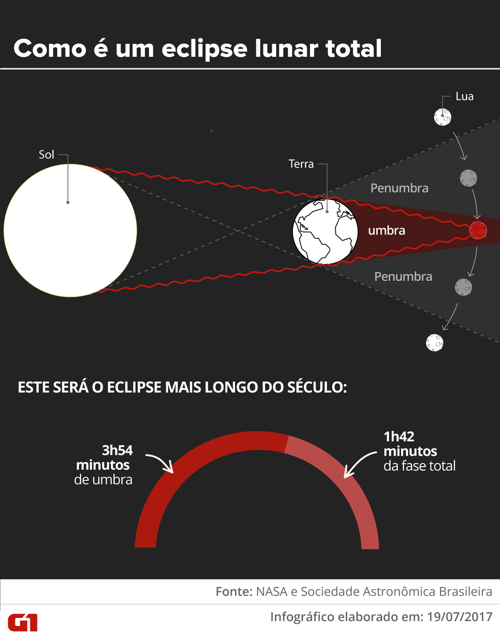 hoje! O eclipse lunar mais longo do século terá 1h42 de fase total e quase 4 horas de parcial nesta sexta-feira (27). Para assistir, é só checar a hora que a Lua nasce na sua cidade e estar mais perto da costa possível, no leste do Brasil.