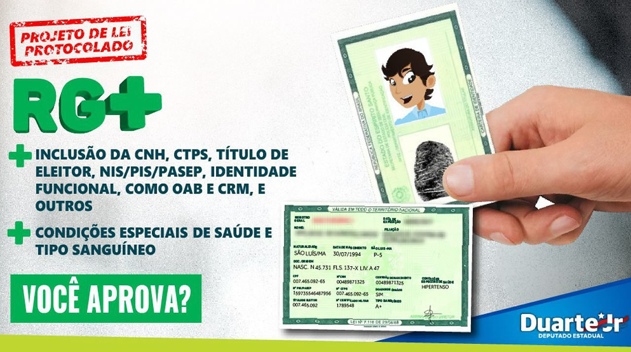 A carteira de identidade do maranhense agora pode ser um mais do que um documento. Literalmente. Projeto de lei do deputado estadual Duarte Jr. sugere a criação do RG+, com dados de outros documentos na carteira de identidade, assim como condições de saúde especiais.