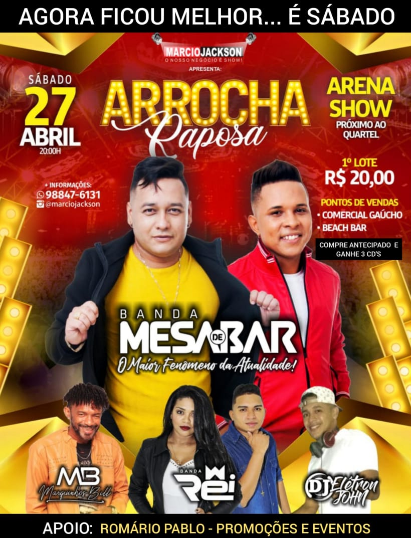 Aguarde o mega show da Banda Mesa de Bar, na arena show enfrente ao quartel da Raposa, ingressos antecipados no Gaúcho e Beach Bar, valor de 20,00 e na compra ganha 3 cds.
