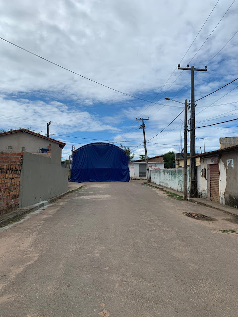 Uma das ruas principais da cidade de Cajari, interditada desde sexta feira. Local o de ocorreu a festa privada em que ocorreu a tentativa de homicídio praticada pelo irmão de Altemar Lobato, presidente da Câmara, contra o filho de Luiz Rego, ex-vereador e aliado de Altemar e da prefeita Camila Jansen Pereira.