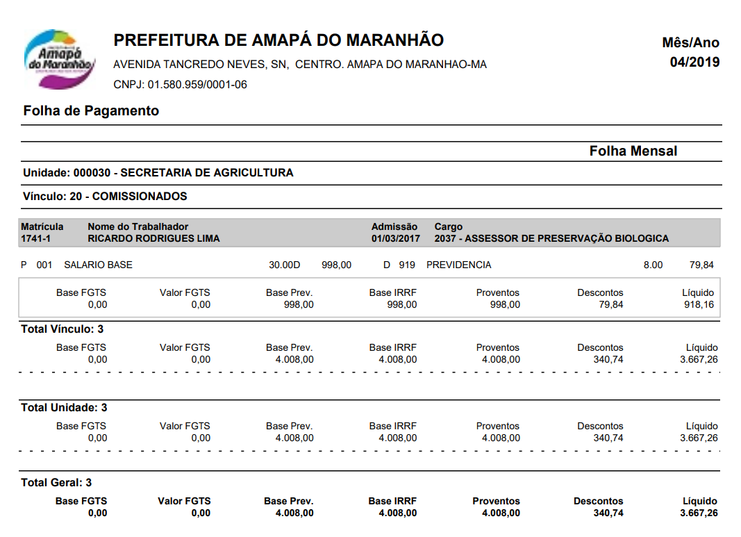 O Ricardo Rodrigues Lima foi nomeada como Assessor de Preservação Biológica, e o seu Salário é de R$=5.006,00 (Cinco mil e seis reais) ele recebe mais que o Secretário de Agricultura R$=2.010,00 uau.