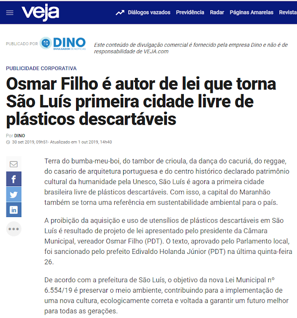 A aprovação da lei que veta a aquisição e uso de copos e demais utensílios plásticos descartáveis em todos os órgãos (Secretarias, Empresas Públicas e Fundações, por exemplo) da Administração Pública do Município de São Luís foi destaque no portal da Veja e do Estadão, ambos do estado de São Paulo.