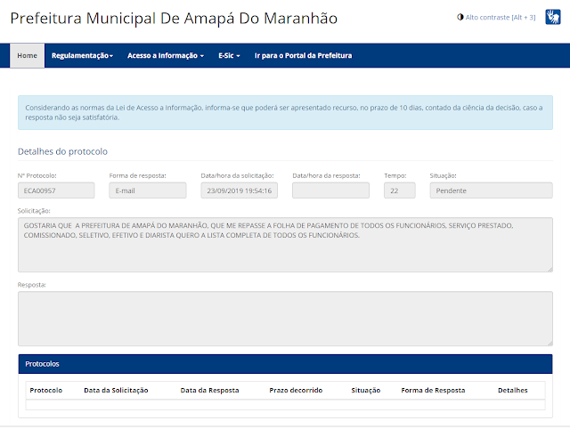 Foi solicitado um protocolo ECA00957 no E-sic da Prefeitura de Amapá do Maranhão, e até o momento não obteve resposta, o Titular do Blog fazer uma denúncia formal contra a administração por descumprir a lei da Transparência, que a prefeitura ainda não disponibilizou a folha de pagamento de todos os funcionários, e está a mais de 4 meses sem ser atualizado no site da Transparência, e as informações incompletas para a população de Amapá fazer a pesquisa no site oficial www.amapa.ma.gov.br.