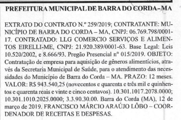 Atenção Ministério Público, Prefeitura de Barra do Corda supostamente fez licitação suspeita de quase Um Milhão de Reais em Alimentos, a aquisição de gêneros alimentícios vai custar R$ 943.450,25 mil (novecentos e quarenta e três mil e quinhentos e quarenta reais e vinte e cinco centavos) em Barra do Corda. O contrato quase milionário foi firmado com empresa da cidade de Imperatriz .