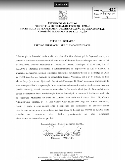 O que chamou atenção do blog foi exatamente o valor destinado a contratação da empresa, ao que parece a prefeitura não está se preocupando com a pandemia do COVID-19, e pelo visto prefere se prepara para distribuir caixões do que investir em materiais de EPI e insumos que venham auxiliar ao combate da pandemia para seus funcionários trabalharem, o valor real destinado a contratação da empresa é R$R$ 275.259,20.
