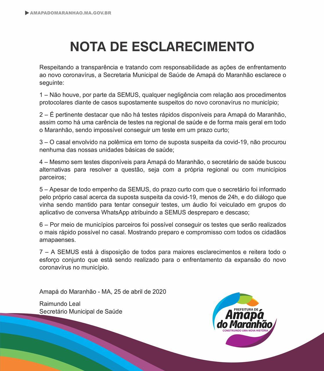 A prefeitura de Amapá do Maranhão lançou uma nota, alegando que a dois casos suspeitos de coronavírus no município de Amapá do Maranhão. Veja a nota abaixo.: