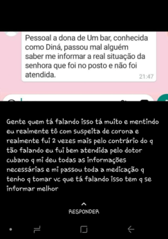 O Titular deste blog, de praxe averiguar as informações e a própria afirma que está com suspeita de coronavírus, e até o momento a prefeitura, não informou o boletim epidemiológico de suspeitos de covid-19 no município, a própria Cidá afirma que é suspeita, e que foi atendida e já está em casa isolada tomando medicamentos.