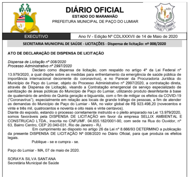 a contratação direta, através de Dispensa de Licitação, visando a Contratação emergencial de serviço especializado de sanitização de áreas públicas do Município de Paço do Lumiar, utilizando produto desinfetante à base de quaternário de amônio de Quinta geração e biguanida, com o fim de mitigar os efeitos da COVID-19 (“Coronavírus”), especialmente em relação aos locais de grande tráfego de pessoas, a fim de atender as demandas do Município de Paço do Lumiar – MA.