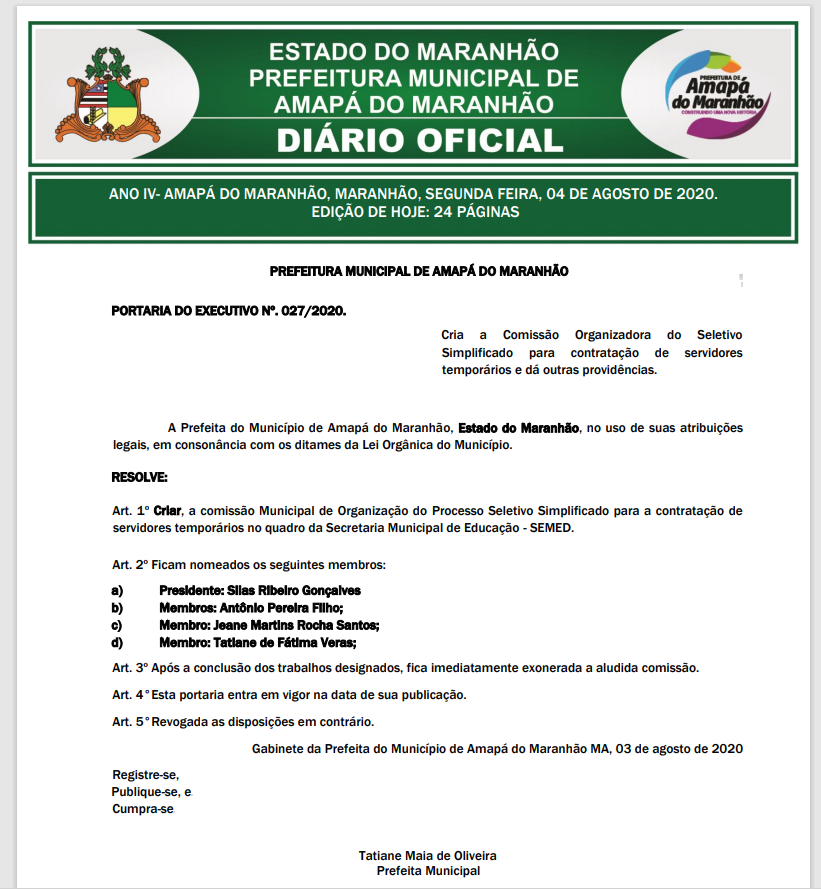 A Prefeita Tatiane maia decreta seletivo na maior cara de pau, e o ministério público não faz nada, de tantas irregularidade, que a prefeita e seu marido vem fazendo no município de Amapá do Maranhão, e essa e mais uma que estão fazendo bem debaixo dos olhos do ministério público e não toma as devidas providencias.