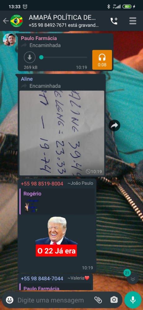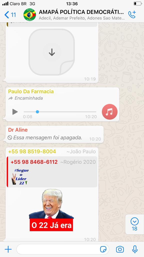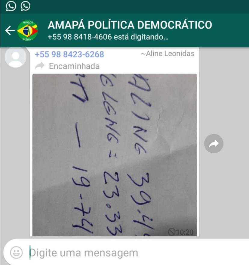 Hoje por volta das 10:20 da Manhã a Pré-candidata Aline Lacerda do partido (Avante-70), comete crime eleitoral, ao enviar resultados de uma suposta pesquisa feita em caneta e papel, manipulando assim resultados, segundos depois apagou a mensagem pra não deixar rastro, mais as rede socias tem suas artimanhas, é alguns dos usuários registraram momento exato que a pré-candidata posta é exclui rapidamente os resultados de uma pesquisa em amapá do maranhão.