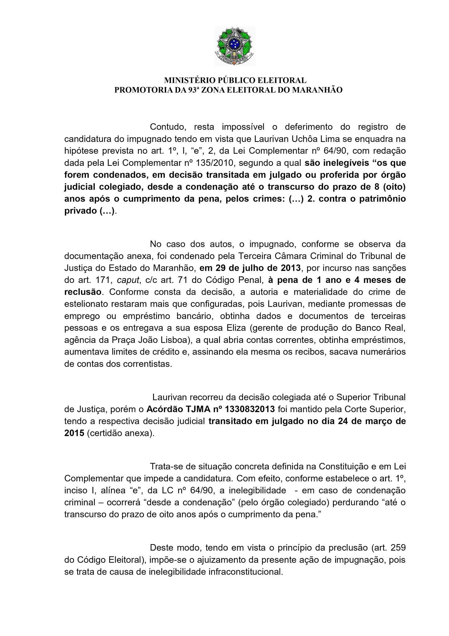 Laurivan recorreu da decisão colegiada até o Superior Tribunal de Justiça, porém o Acórdão TJMA nº 1330832013 foi mantido pela Corte Superior, tendo a respectiva decisão judicial transitado em julgado no dia 24 de março de 2015 (certidão anexa). Trata-se de situação concreta definida na Constituição e em Lei Complementar que impede a candidatura. Com efeito, conforme estabelece o art. 1º, inciso I, alínea “e”, da LC nº 64/90, a inelegibilidade – em caso de condenação criminal – ocorrerá “desde a condenação” (pelo órgão colegiado) perdurando “até o transcurso do prazo de oito anos após o cumprimento da pena.” Deste modo, tendo em vista o princípio da preclusão (art. 259 do Código Eleitoral), impõe-se o ajuizamento da presente ação de impugnação, pois se trata de causa de inelegibilidade infraconstitucional.