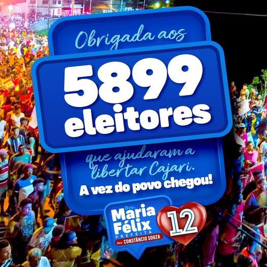 A esperança de dias melhores virão pra Cajari, depois de 12 anos de pesadelos, a esperança voltou a brilhar nos olhos dos cajarienses com a Vitoria da Drª Maria Felix, em Cajari, o povo aclamava com mudanças esperança e compromisso com o povo isso a Maria Felix tem de sobre, mulher guerreira, de fibra. A Drª Maria Felix está agradecendo a todos os Cajarienses todos os votos que lhe deram pra administra uma bela cidade que estava esquecida no tempo.
